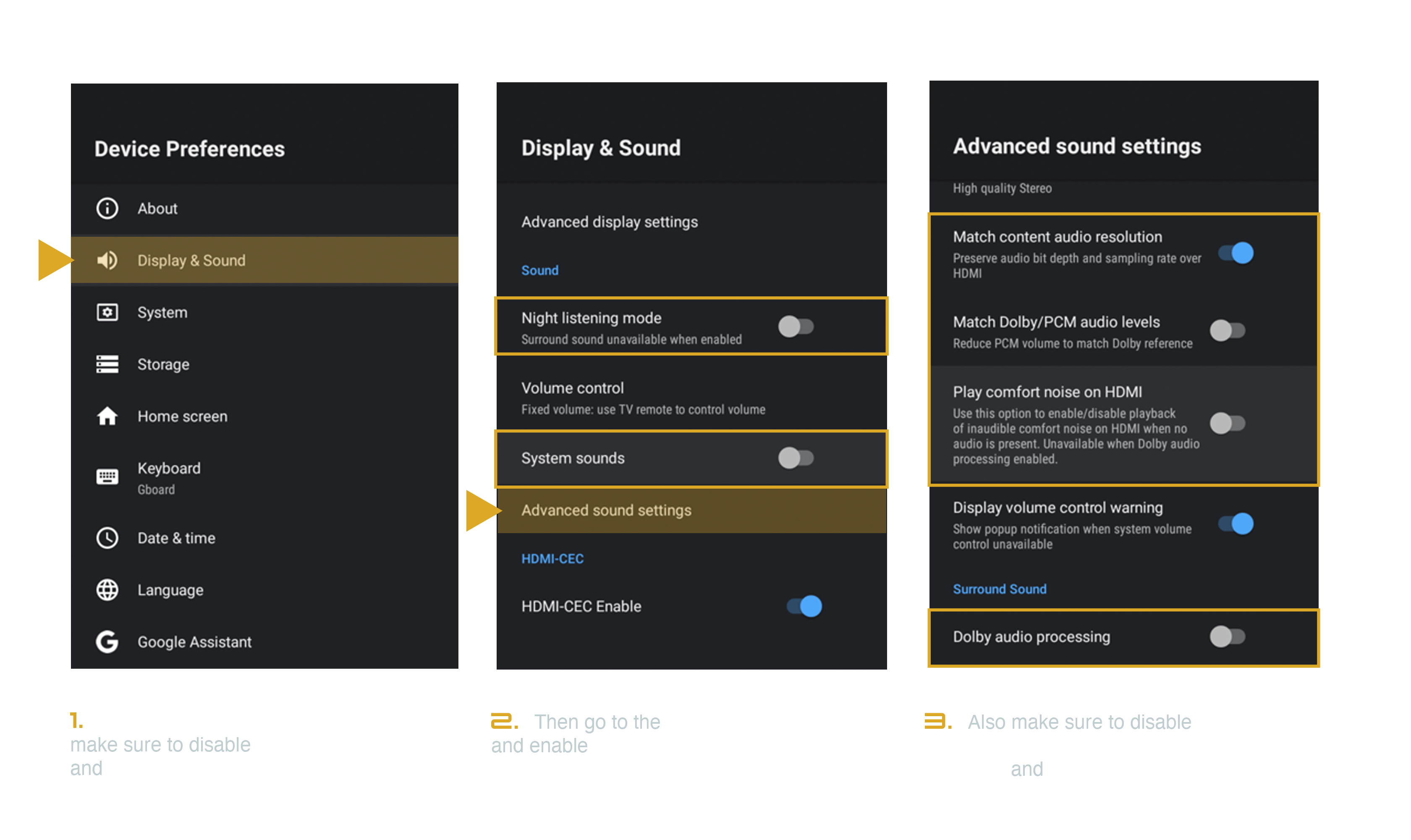 Also, make sure the HDMI output is set to use the correct sample rate for the content you which to play. If possible, avoid that any other sound (e.g. system sounds) is played through the same output and the all volume controls are set to 0 dB.