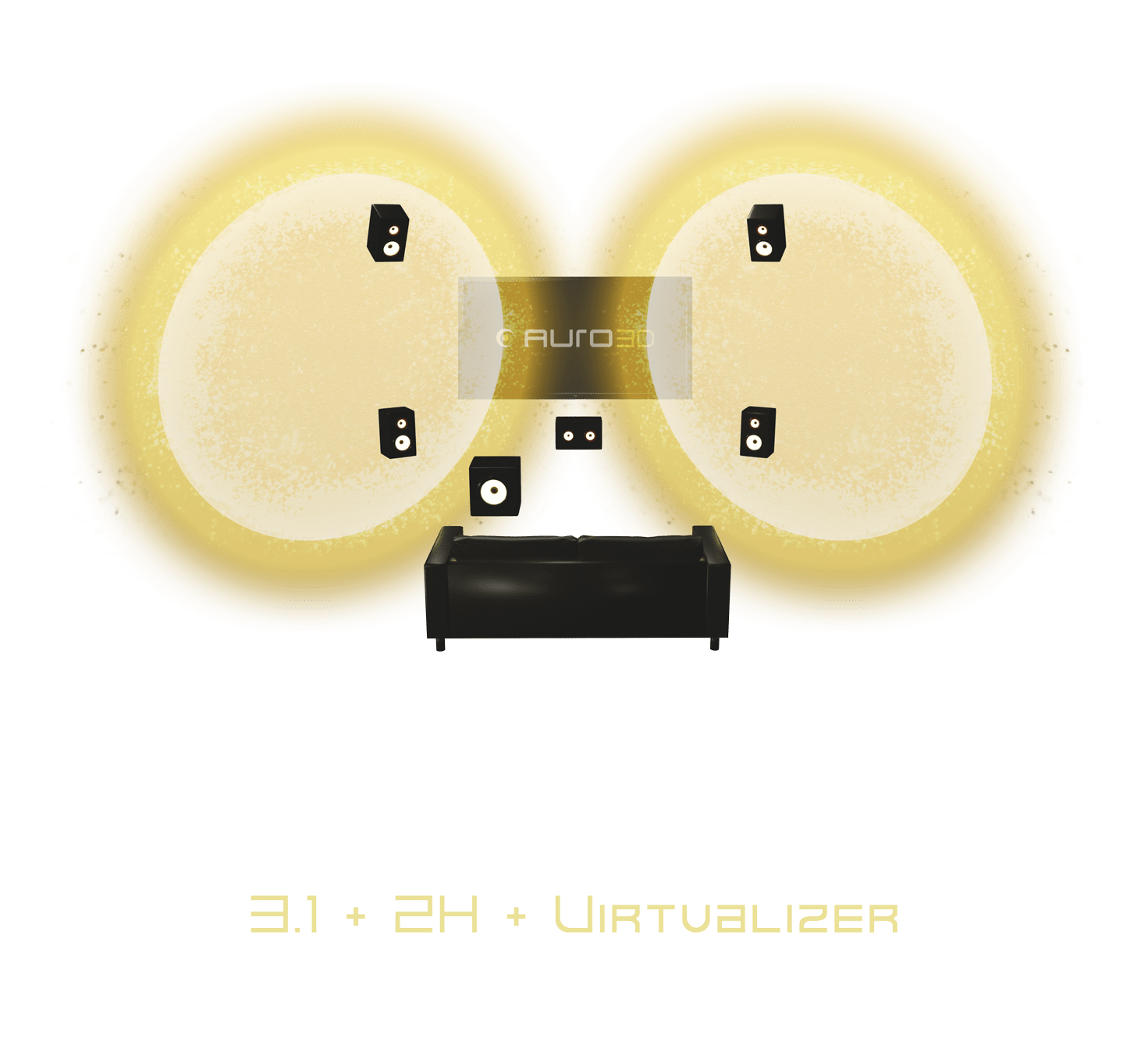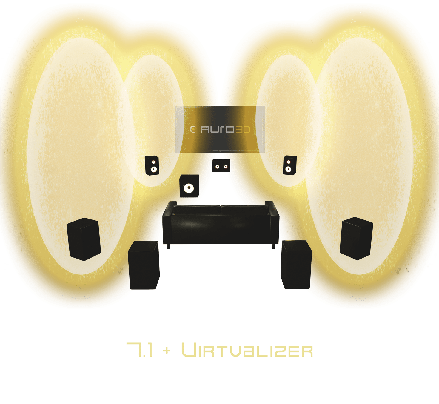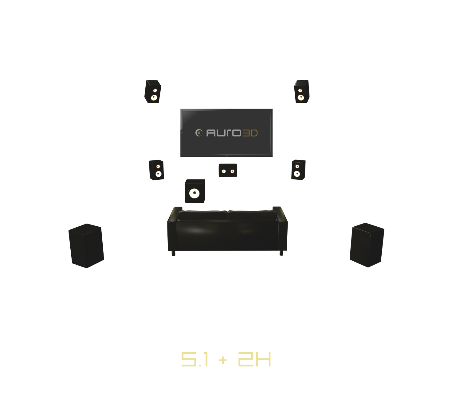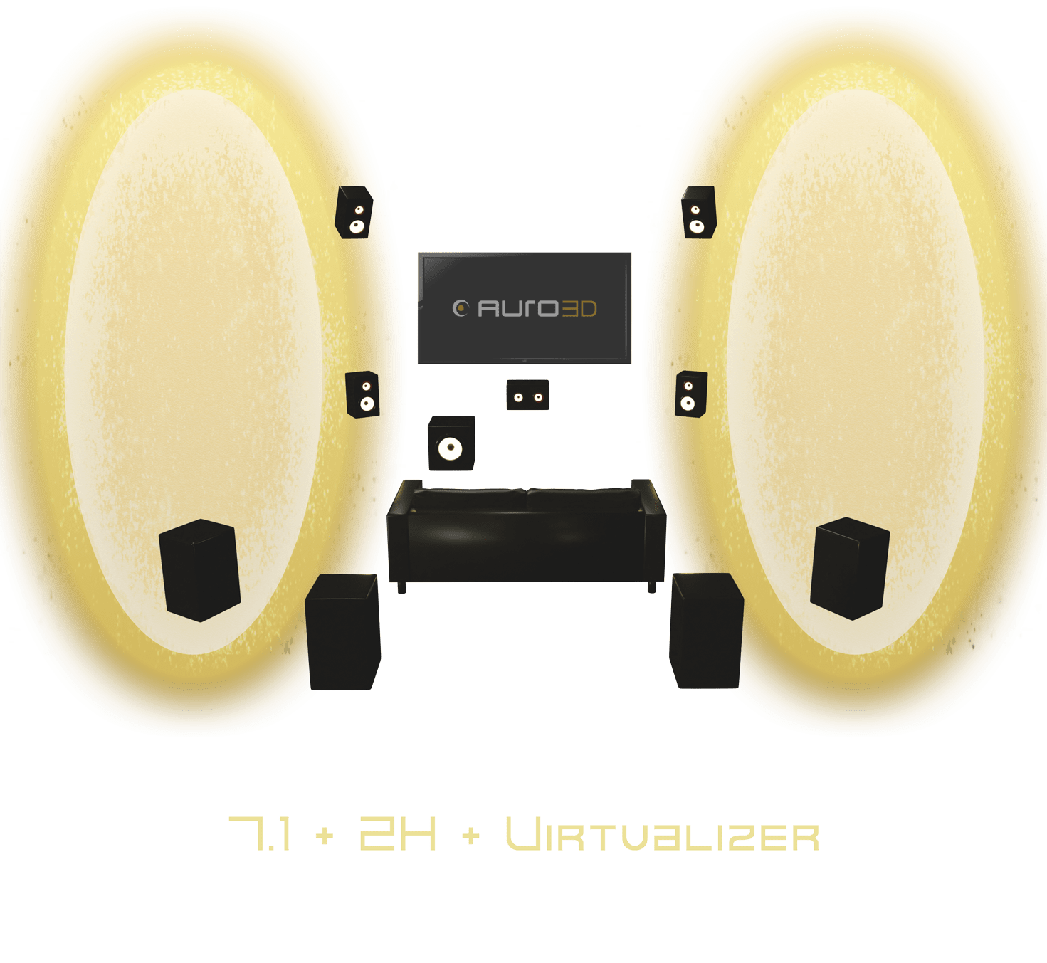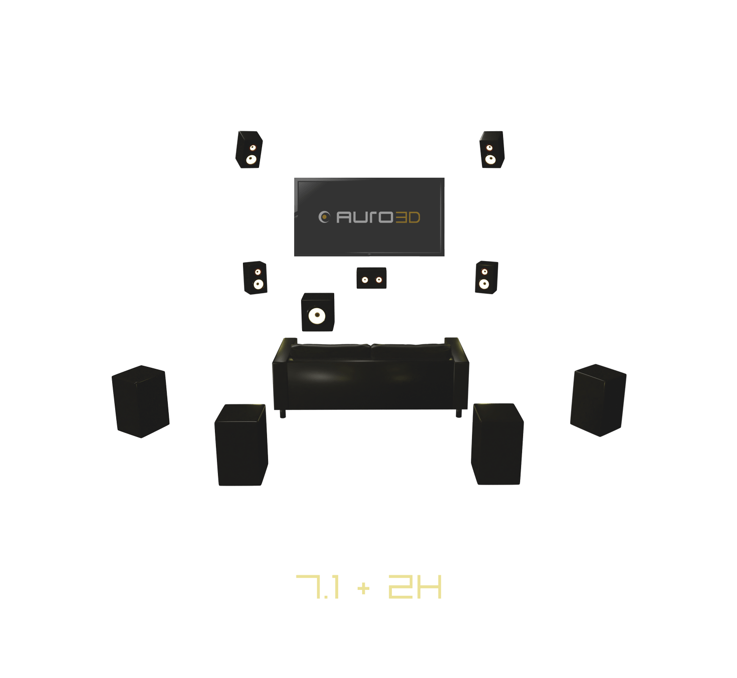 Standard 7.1 surround configuration with two Front Height speakers. Extended setup to experience large, transparent sound image in front of listener, typically centered around a screen in a smaller room, combined with the extended surround experience. Immersive sound (height) can be experienced using virtual speaker technology.