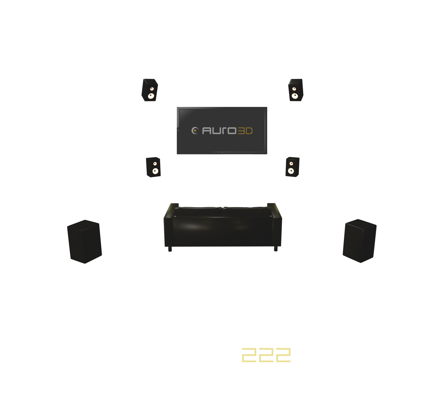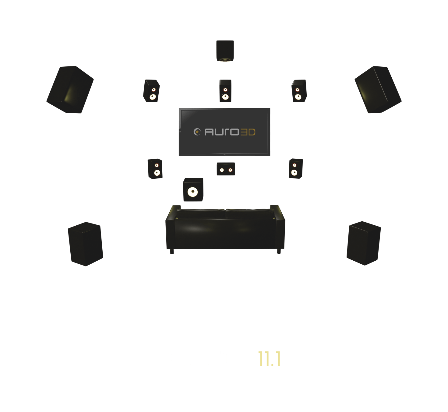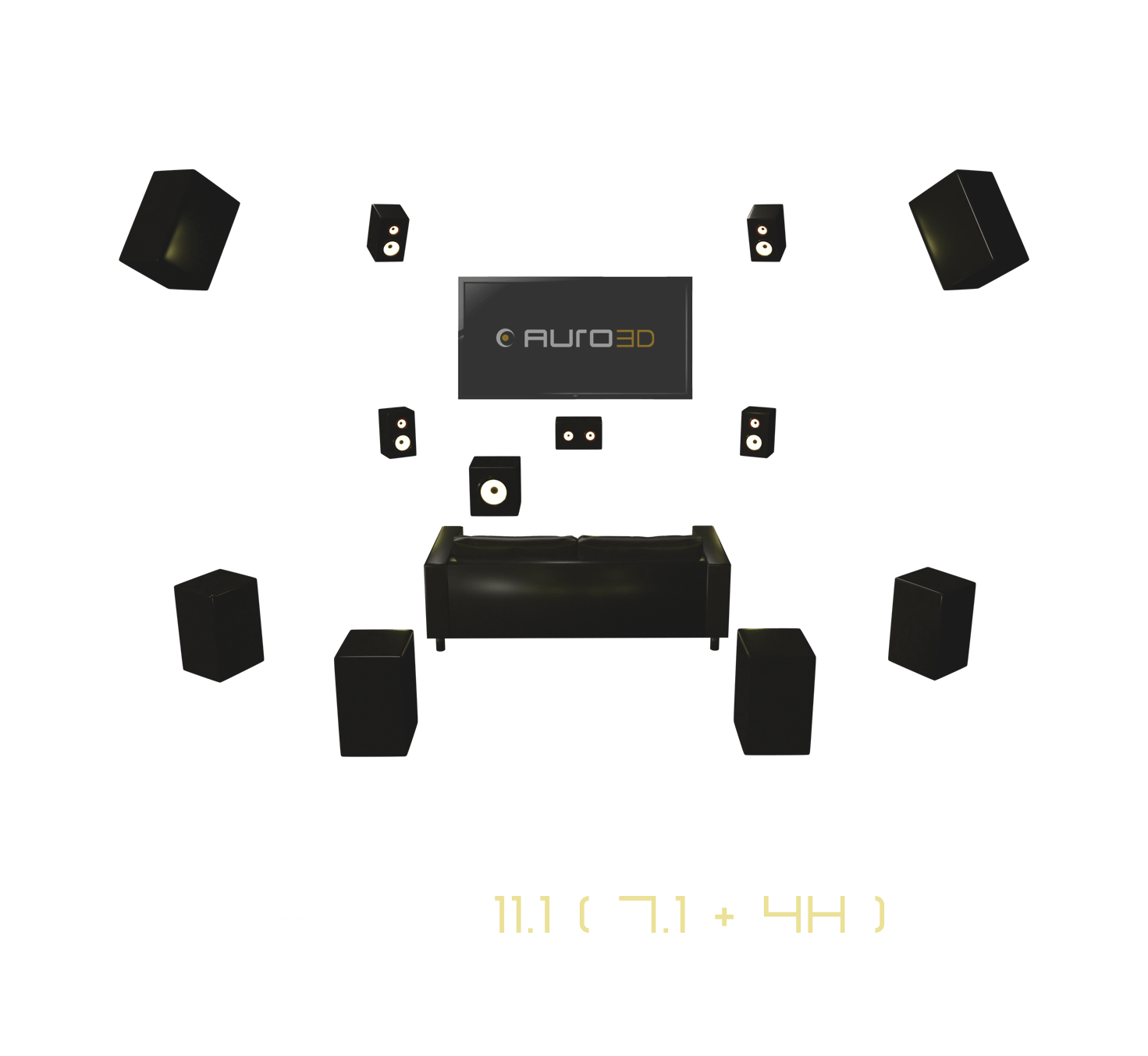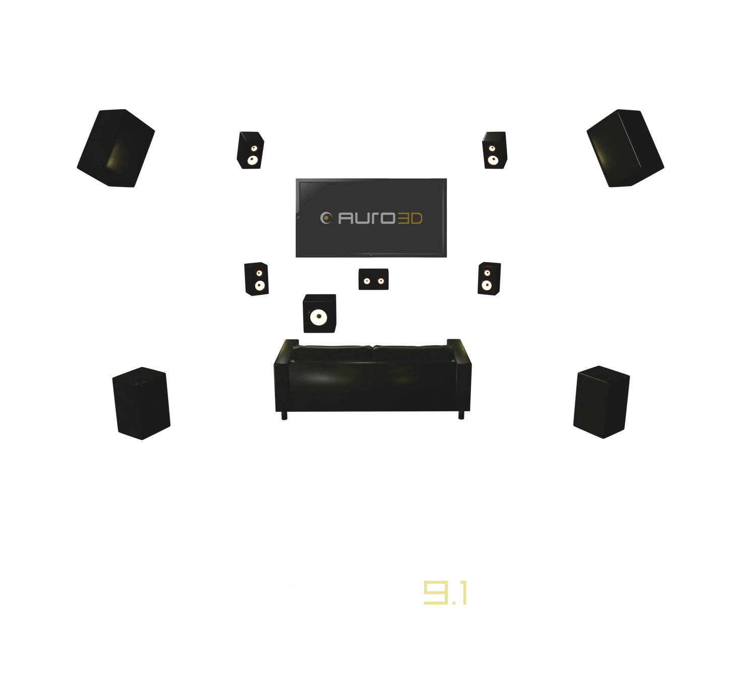 Standard 7.1 surround configuration with two Front Height speakers. Extended setup to experience large, transparent sound image in front of listener, typically centered around a screen in a smaller room, combined with the extended surround experience. Immersive sound (height) can be experienced using virtual speaker technology.