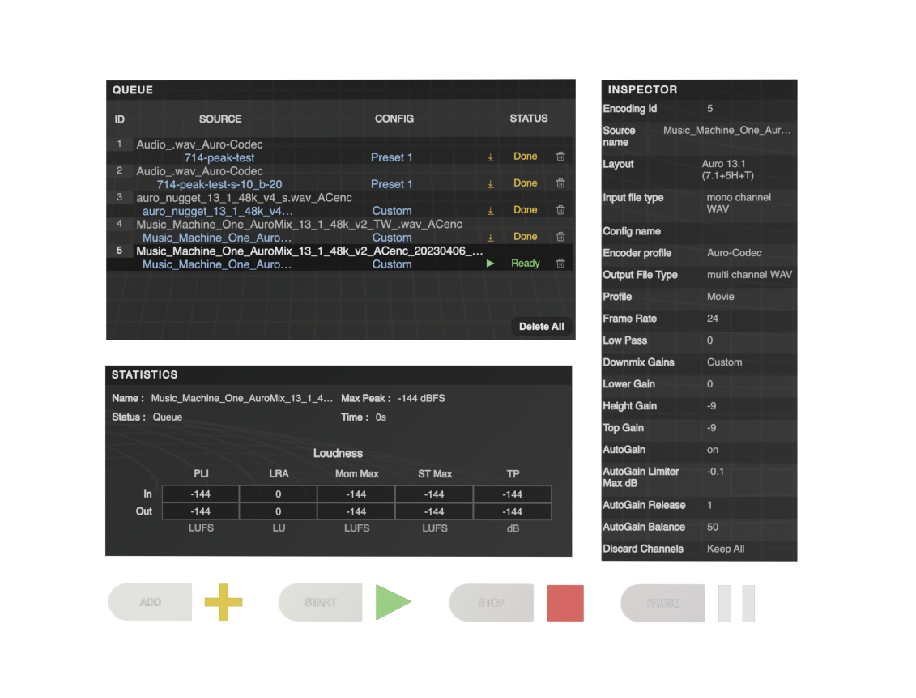 Encode channel-based and object-based audio into fully professional Auro-Codec encoded immersive mixes.