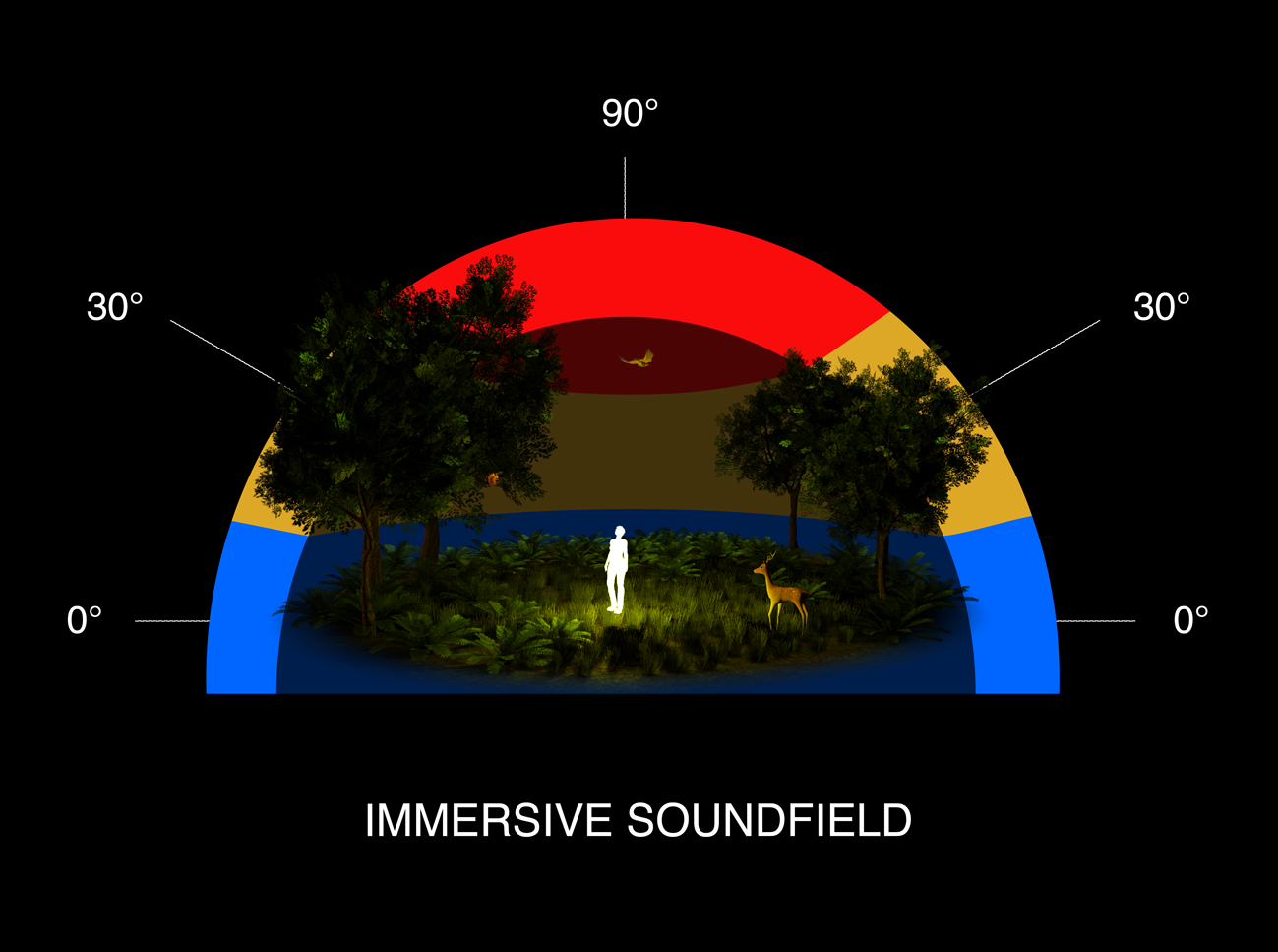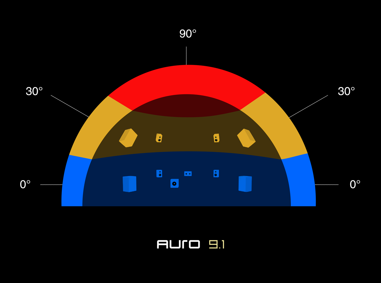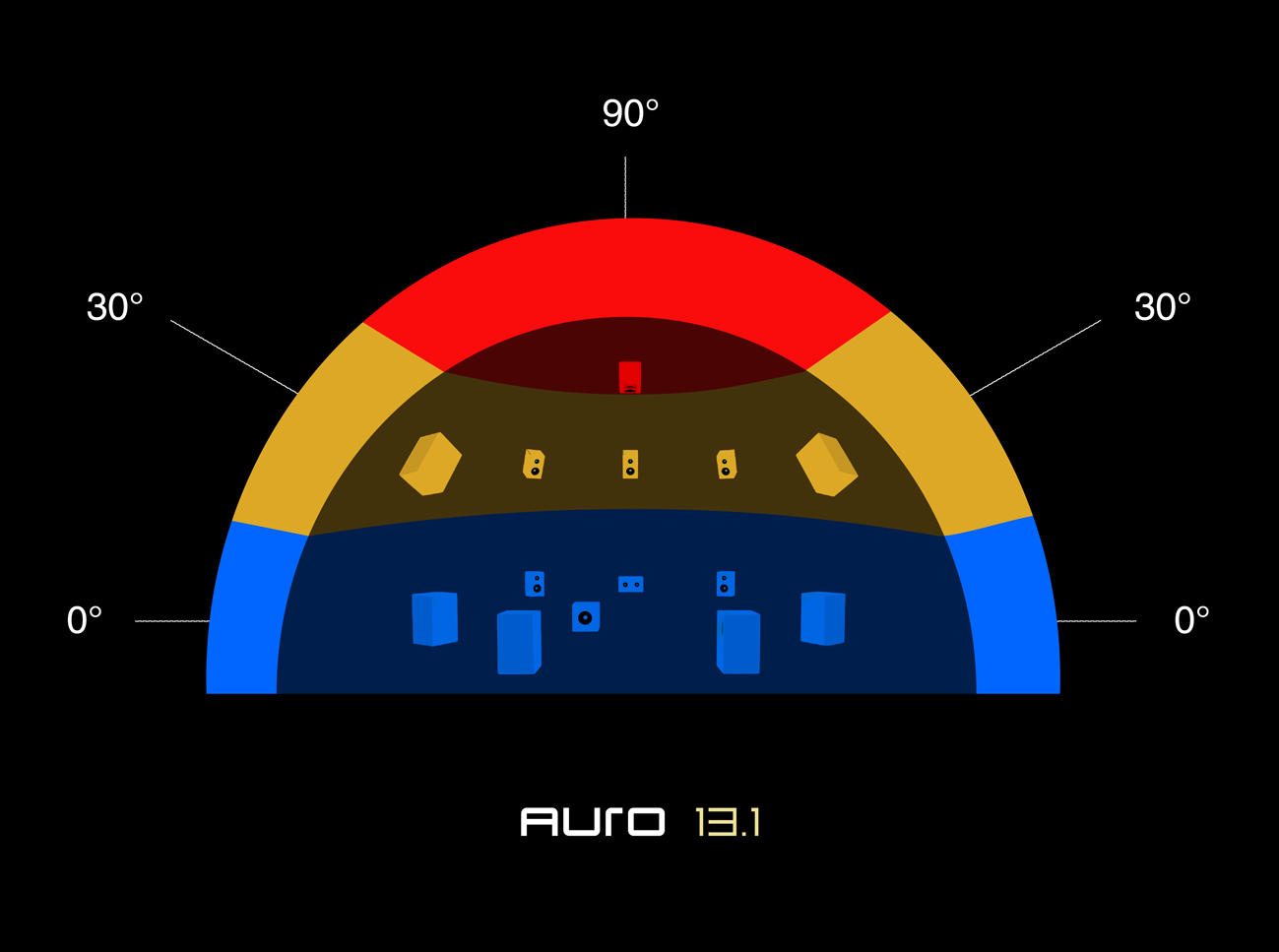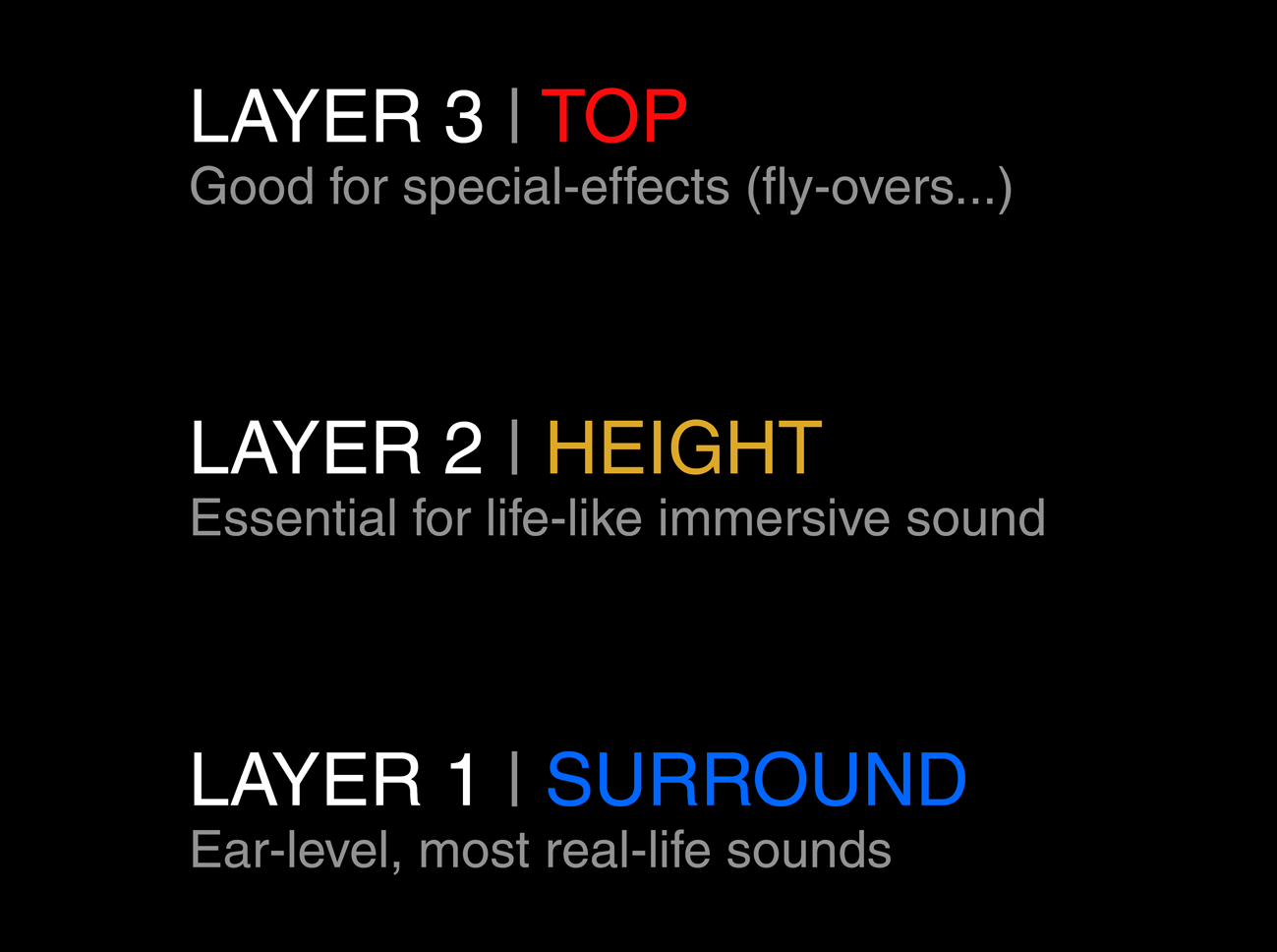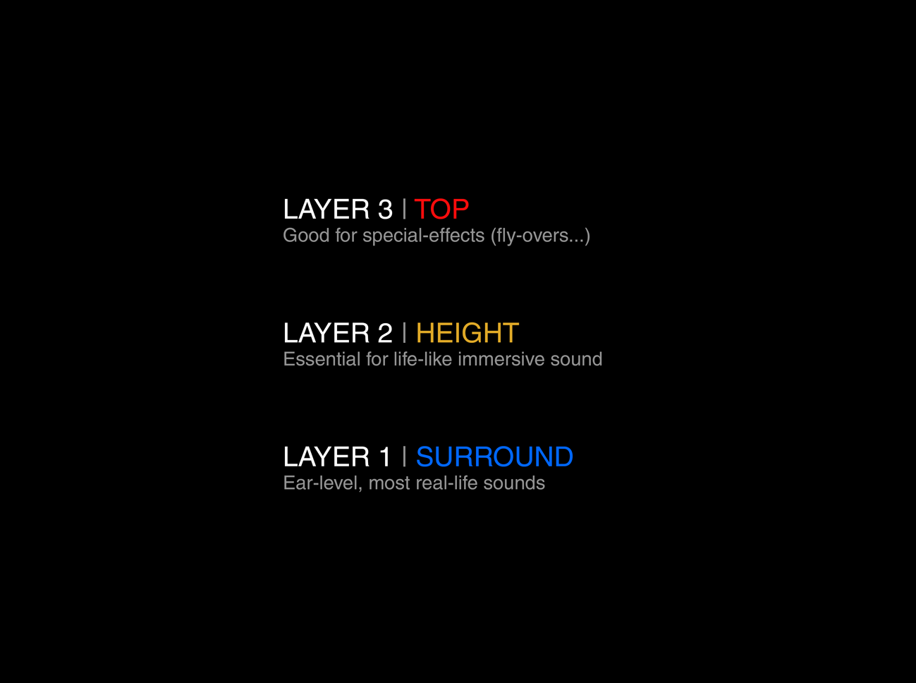 Based on various acoustical principles, AURO-3D’s unique concept divides the soundfield around the listener in 3 different layers: the Surround, Height and Top layers.