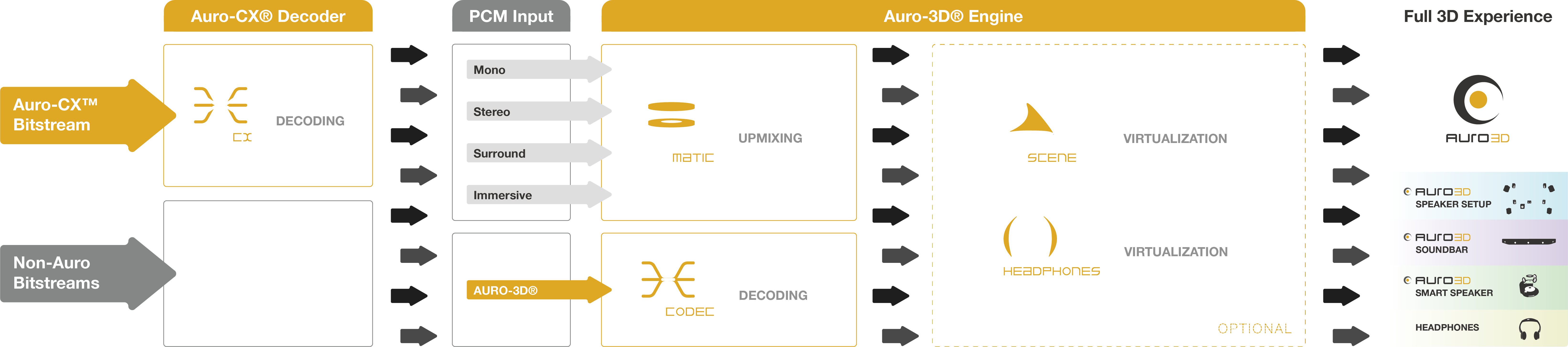 For optimal results with all kinds of inputs and output configurations, the Auro-Codec decoder is integrated in the AURO-3D Engine.